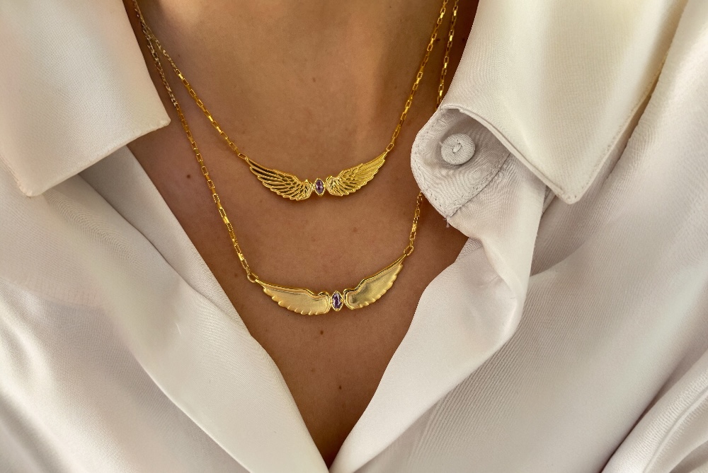 Φτερά κρεμαστο από επιχρυσωμένο ασήμι 925 και καρφωμένο ζιργκον στο κεντρο με μήκος 45 cm
