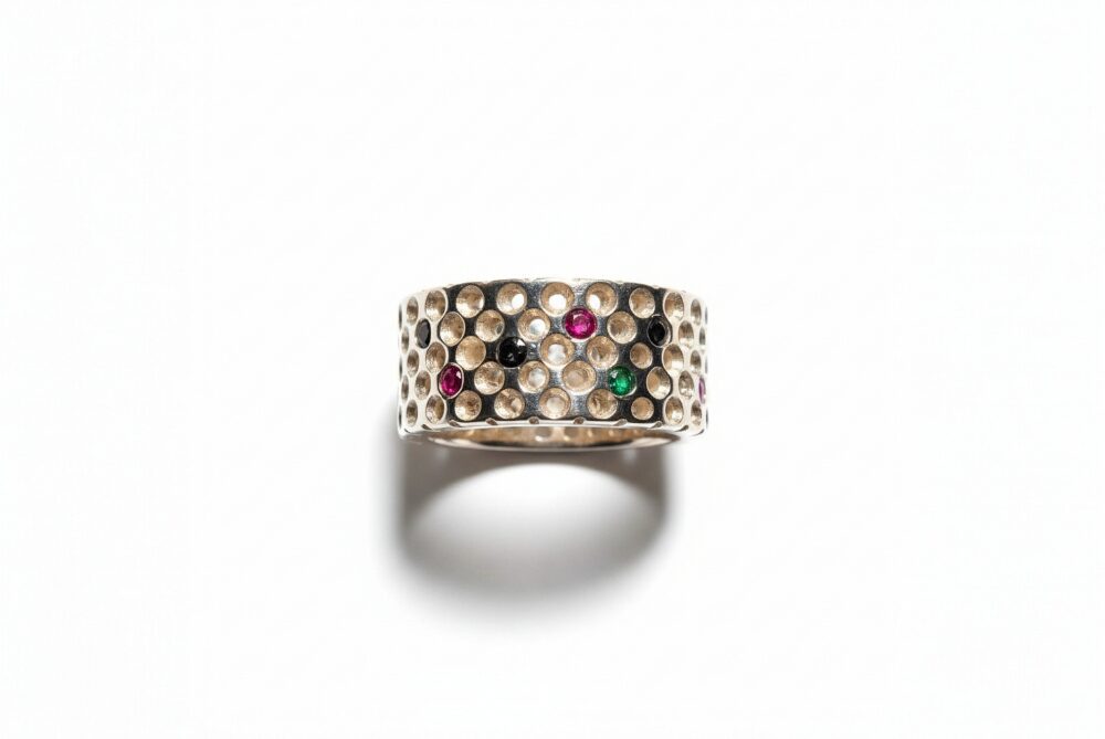 Χειροποίητο δαχτυλίδι από ασημι925 όλο τρύπες με καρφωμένα ζιργκον μαύρο-κοκκινο-πρασινο